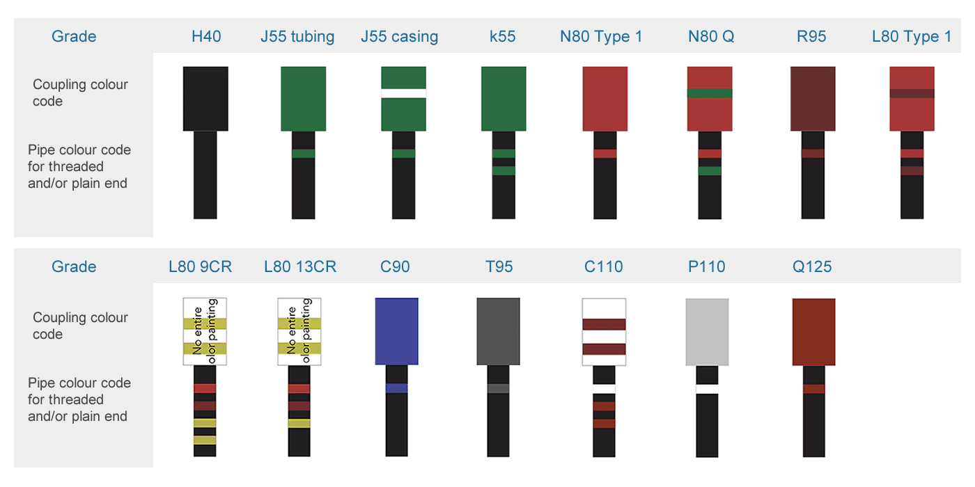 Tubing pipes are manufactured in seamless and welded execution, in the size range of 1.050 to 5 1/2 inches (consult this article to see the AP5CT tubing pipes sizes) and in the following material grades: H-40, J-55, K-55, N-80, L-80, C-90, T-95, P-110, Q-125